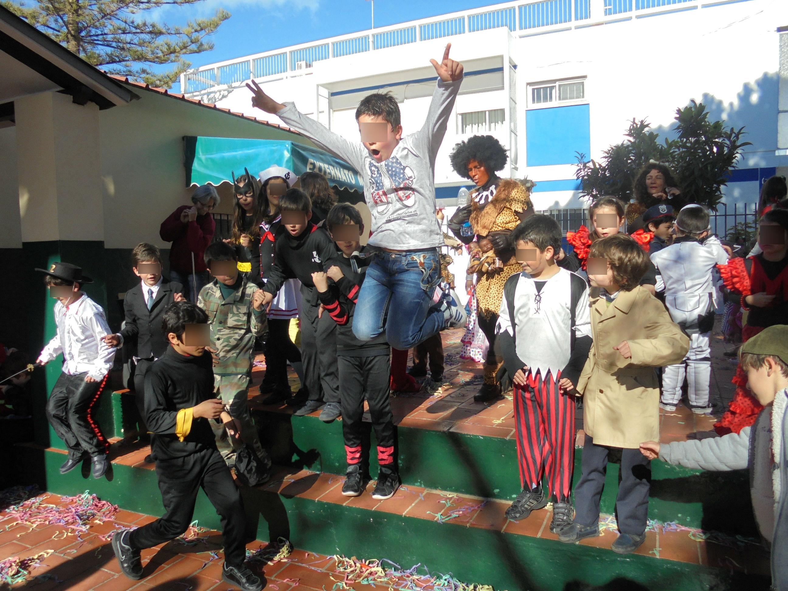 De manhã, e depois de um curto momento de brincadeira e de organização dos alunos no Colégio, fomos brincar no parque da Alameda. Não participamos no desfile da baixa da cidade por opção, e por entendermos que o dia é dos mais pequenos e a brincadeira não é substituível por um desfile formal- mais interessante para familiares –  isento de jogos, corridas, tropeções, lutas imaginárias e outras tropelias….Depois do almoço brincámos, dançámos e desfilámos. Este ano, a dinâmica e a animação constante deu azo a um desfile, no Colégio, menos estruturado e mais autónomo. Fizemos “o comboio” onde todos participaram. Os meninos até se esqueceram de jogar à bola.  A brincadeira só chegou ao fim com a chegada dos pais….VIVA o CARNAVAL!!