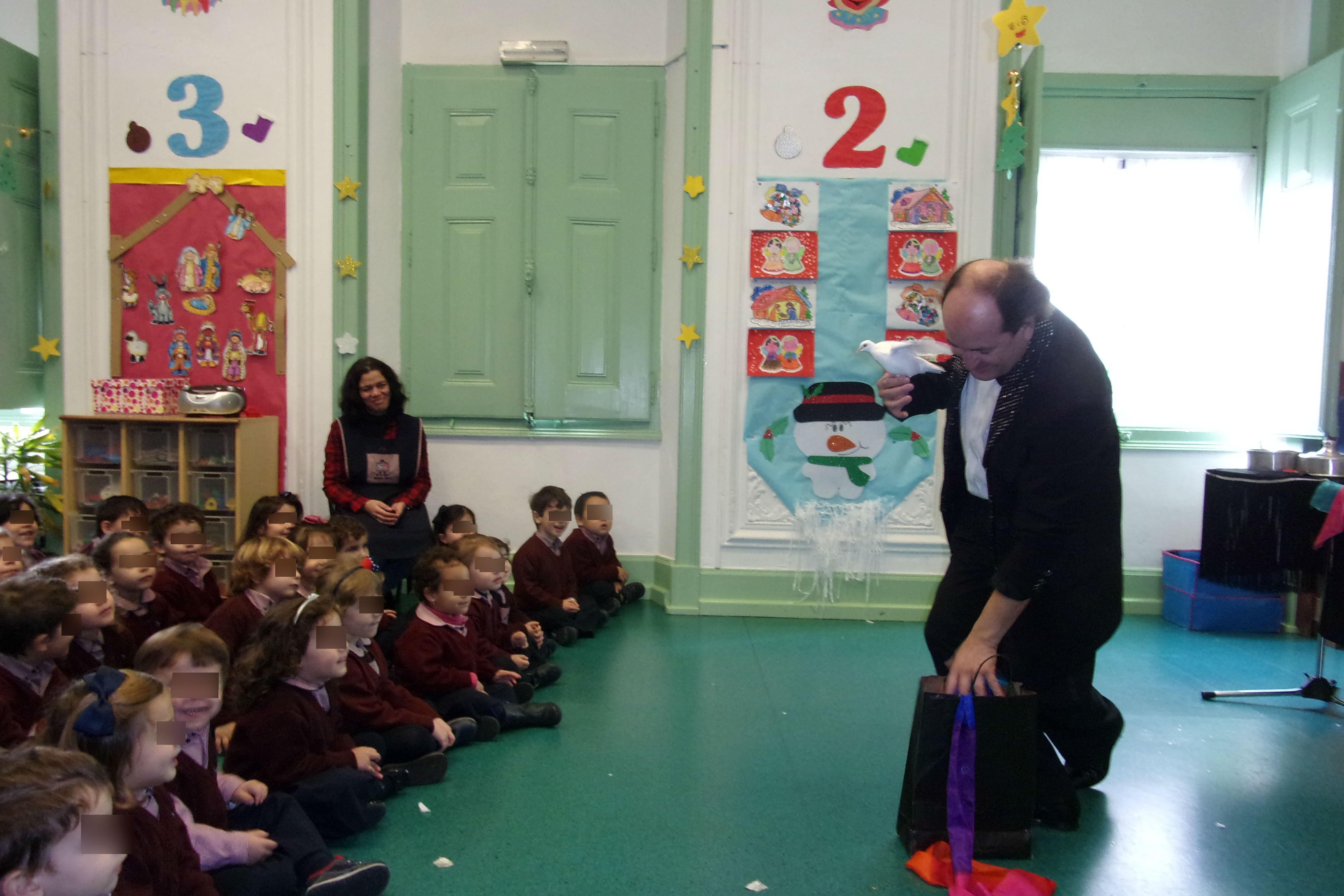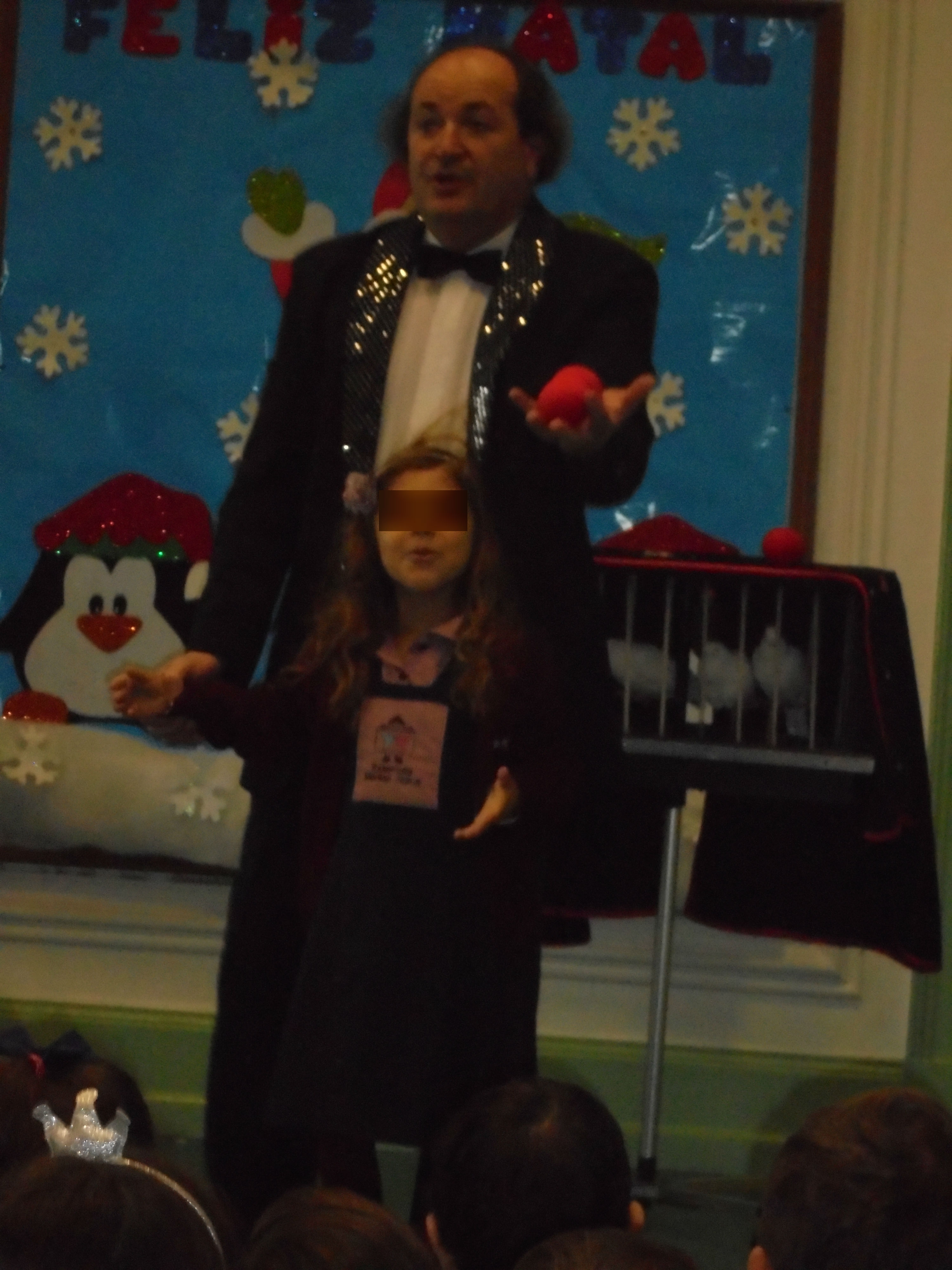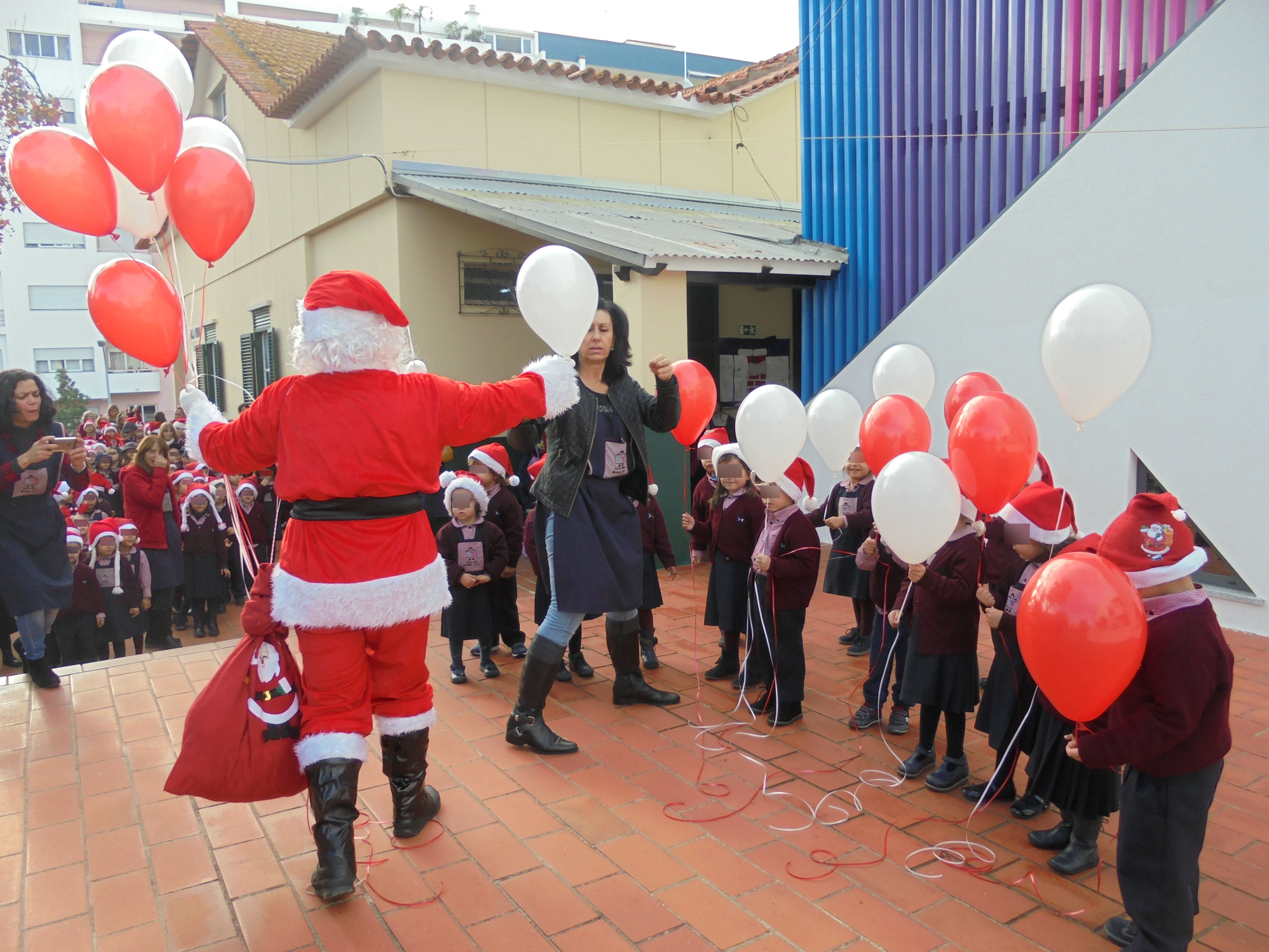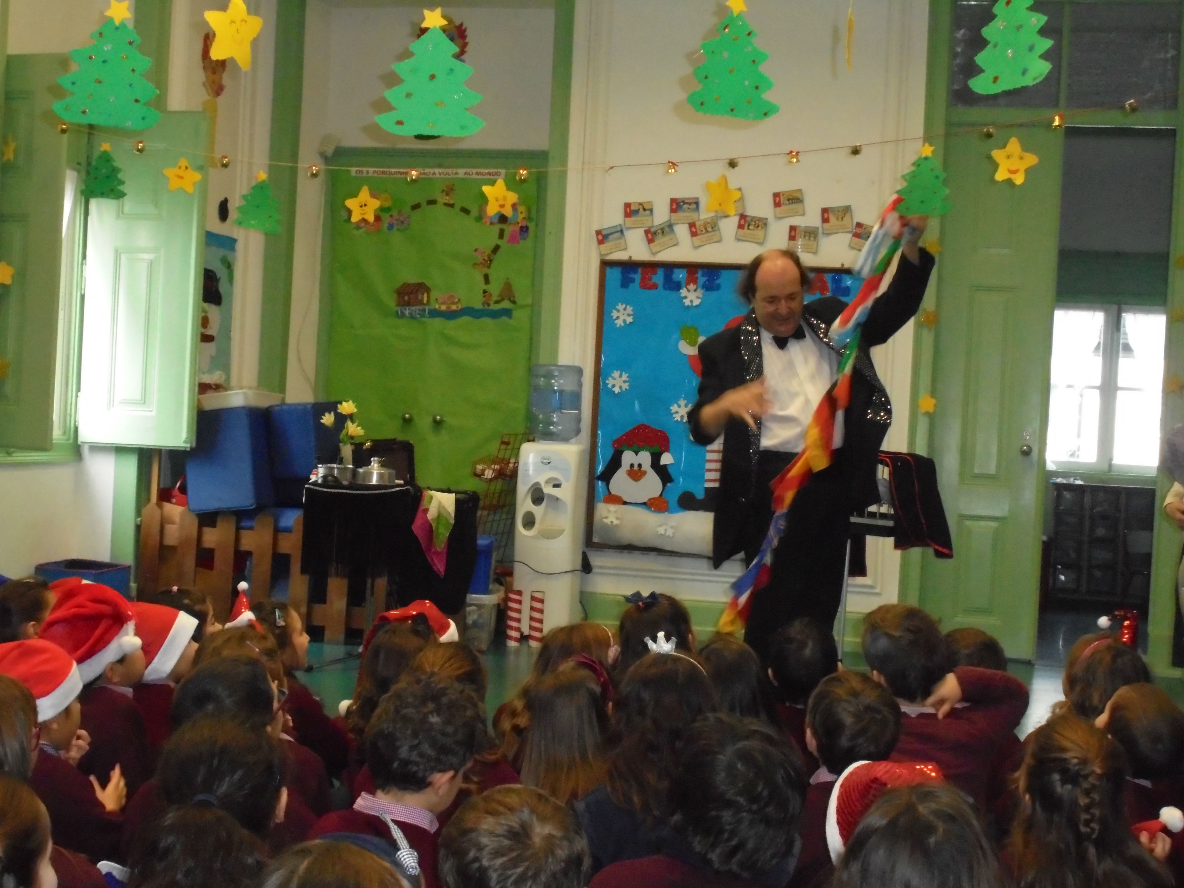 O dia da festa de Natal – na Escola – é sempre um dia mágico. Este ano especialmente! A vinda à nossa festa de Natal do mágico Ambrósio foi extraordinária. O mágico, num espetáculo surpreendente para crianças e adultos deslumbrou com os seus truques. As pombas, que apareciam e desapareciam, as flores, os lenços e as moedas que como por encantamento mudavam de local, de dimensões e até de cor, entusiasmaram e deixaram incrédulos todos os que assistiram ao espetáculo. A vinda do Pai Natal, no período da tarde, que não se esqueceu de nos visitar, deixou-nos os muito aguardados presentes. Este ano, para os mais pequenos (sala dos 3 anos) realizámos, com a ajuda do pai Natal, uma largada de balões vermelhos e brancos que ajudaram ao ambiente de festa e de alegria. Os balões subiram e não pararam de subir….