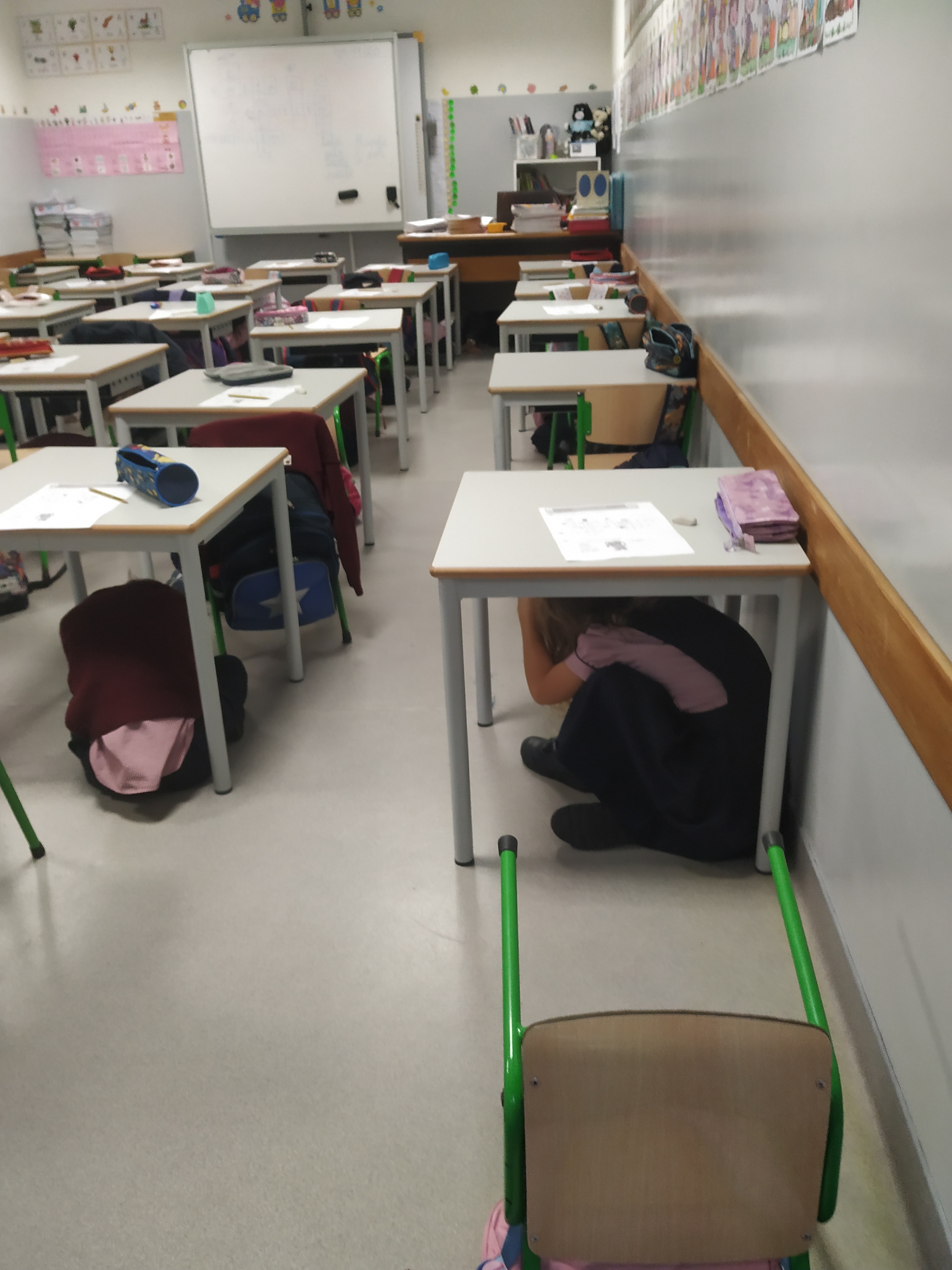 Tem a duração de apenas 1 minuto, durante o qual os todos os alunos foram convidados a executar os 3 gestos que salvam: BAIXAR, PROTEGER E AGUARDAR.